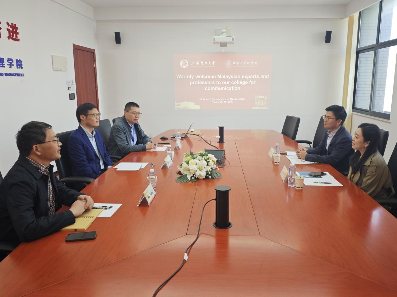 2025年11月10日,马来西亚拉曼大学经济研究中心主任曾繁宇(Chen Fanyu)、助理教授黄芝霖(VIVIEN WONG ZI WEN)来访我院,学院党委书记潘华、院务秘书杨迎春和教师代表马勇出席座谈会,双方围绕办学特色、科研合作及协同发展前景展开深入交流。
