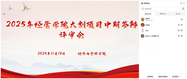 系统评估大学生创新创业项目的阶段性进展情况,强化过程管理,提升创新创业项目质量,11月13日,经管学院对2025年立项的大学生创新创业项目组织进行了中期答辩评审会。上海市工程管理学会秘书长耿秀丽、上海立信会计学院金融学院副院长吴杰和上海海事大学经管学院副院长肖光年作为特邀校外专家参加本次评审会。