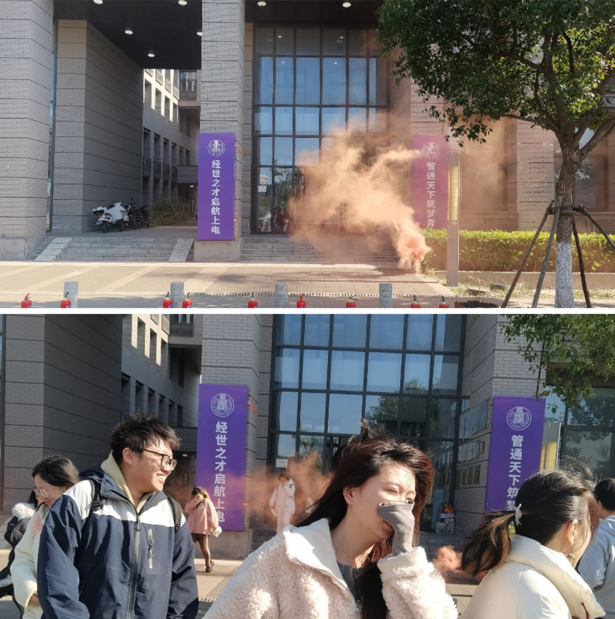 中午12时45分,随着消防警报响起,烟雾弹瞬间释放,现场浓烟弥漫。在实验中心教师和保安队的指挥下,师生们迅速进入应急状态:用湿毛巾捂住口鼻、弯腰低姿前行,按照预定疏散路线有序撤离至安全区域。全程紧张有序,仅用时2分10秒,70名参加演练人员全部安全集合,演练取得预期效果。